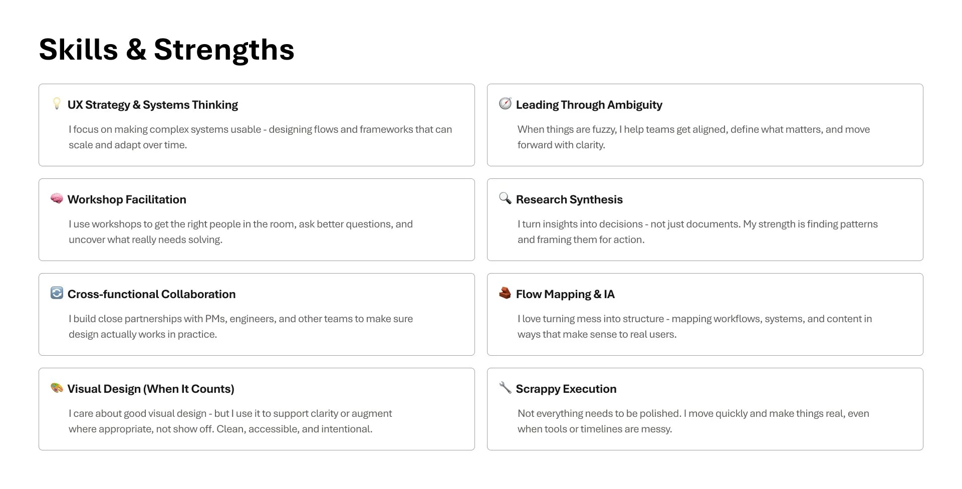 I thrive in ambiguity, ask a lot of questions, and work closely with cross‑functional partners to bring clarity to messy problems (and I love a good design workshop 😆).