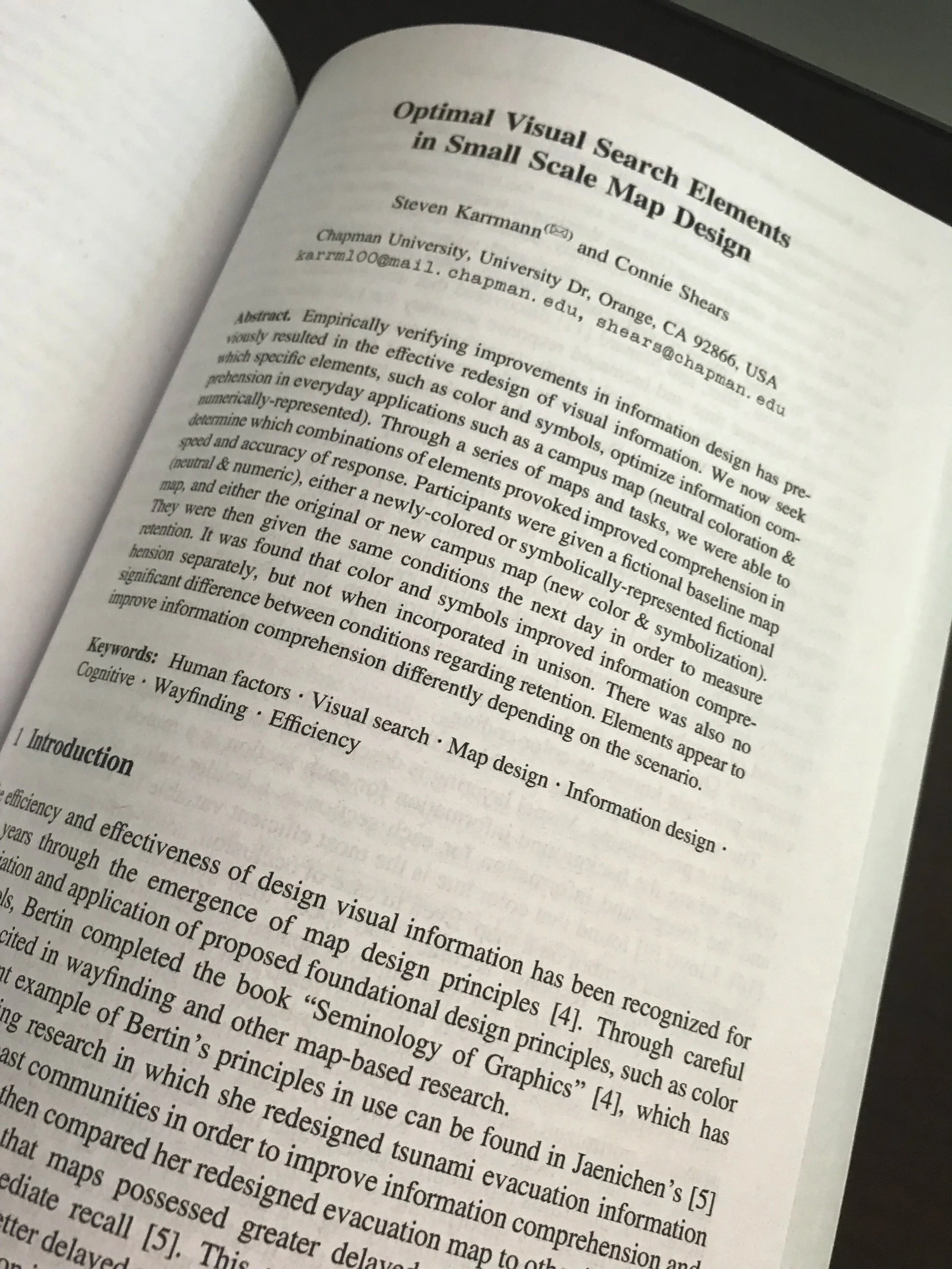 Karrmann, S., & Shears, C. (2017, July). Optimal Visual Search Elements in Small Scale Map Design. In International Conference on Applied Human Factors and Ergonomics (pp. 417-424). Springer, Cham.